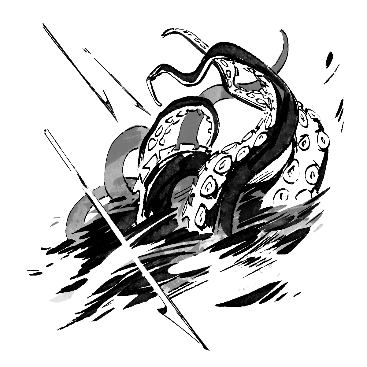 We see our first skoll a few days later. At first it’s just an anomalous glimmer off to starboard. A slab of ice perhaps, or some flotsam. But the scraggly deckhand keeps staring, and then he points and hoots. It’s then that we see the lidless eyes and a spread of panicked tentacles seething beneath the glassy waves.